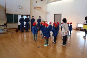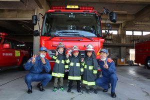 続いて、館内の見学、普段見ることができない消防士さんたちの仮眠室や食堂も見学させていただきました。田川地区消防本部には、3種類の制服を着ている隊員さんが勤務されていて、制服によって行っている仕事が違うとの説明を受けました。最後に消防隊員さんと『記念撮影』を行い、『火遊びをしないことを約束し』保育所に帰ってきました。
