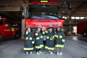 保育所から消防署までは20分くらいで到着します。到着後、消防隊員さんにご挨拶を行い、本日の内容の説明を受けました。