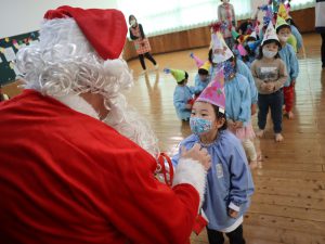クリスマスの日よりも少し早く『サンタクロースさん』が保育所の子どもたちにプレゼントを届けに来てくれました。はじめに『たまご・ひよこ・うさぎ組さん』の順番に教室を回り『プレゼント渡し』と『記念撮影』を行いました。大きなサンタさんに泣き出す子もいましたが、みんなサンタさんからプレゼントをもらえ嬉しそうでした。続いて、『くま・らいおん・ぞう組さん』が集まっている【遊戯室】に移動し、子どもたちと一緒に2曲ダンスを踊りました。引き続き、子どもたちがサンタさんに聞きたいことを質問し答えていただきました。続いて、順番にサンタさんからプレゼントをいただきました。最後にクラスごとに『記念撮影』を行い『クリスマス会』を終了しました。