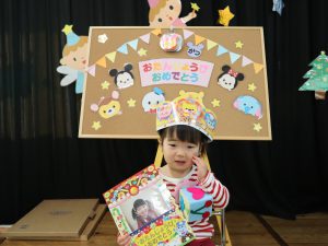 12月生まれのお友だちを全クラスで7名。1名の欠席者がいましたので6名のお祝いをしました。はじめに『お名前、年齢、好きな食べ物、大きくなったら何になりたいか』を発表しました。続いて、みんなで『ハッピーフレンズ』を歌い、担任の先生からのプレゼントと記念撮影を行いました。引き続きみんなで『赤鼻のトナカイ』を歌い、最後に先生から『クリスマスの絵本』を読んでいただき『誕生会』を終了しました。