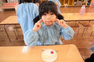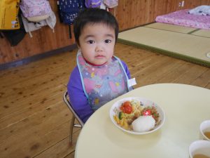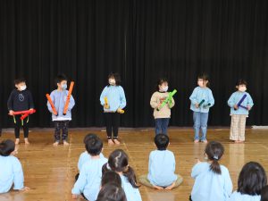 1月生まれのお友だちは全クラスで7名。1名欠席のお友だちがいましたので6名のお祝いをしました。感染予防のため『たまご・ひよこ組さん』は各お部屋で行い。『くま・らいおん・ぞう組さん』はマスクを着用し『遊戯室』で行いました。はじめに『名前、年齢、好きな食べもの、大きくなったら何になりたいか』を発表し、みんなで『ハッピーフレンズ』を歌いました。つづいて、担任の先生からのプレゼント渡しと記念撮影を行いました。お祝いに子供たちみんなで今月の歌『雪だるまのチャチャチャ』を歌いました。引き続き先生から【ドレミパイプ】を使い『きらきら星』の演奏を披露してくれました。その後は、クラスごとに【ドレミパイプ】を使って『きらきら星』の演奏を楽しみました。最後に実習生が絵本『めっきら もっきら どおん どん』の読み聞かせを披露してくれました。