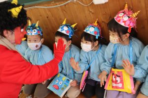 『らいおん、ぞう組さん』は遊戯室に集まり、みんなで『豆まき』の歌を歌い、先生から『じごくのそうべい』と『なぜ節分に豆をまくの』の紙芝居を読んでいただきました。すると廊下から『赤鬼と青鬼』が子どもたちの前にやってきました。前日までの練習では『新聞紙で丸めた豆』を投げていた子どもたちですが鬼を目の前にすると豆をまくことを忘れ泣き出す子どもたちがたくさんいました。しかし、先生の掛け声に合わせて勇気をふりしぼり『鬼は外、福は内』と鬼さんに向かって『新聞紙で丸めた豆』を投げている子どもたちもいました。最後に子どもたちは『自分の中にいる悪い鬼を発表し悪い鬼に負けないようにする』とみんなの前で発表し鬼さんと仲良くなって記念撮影をしました。