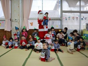 クリスマスの日よりも少し早く『サンタクロースさん』が保育所の子どもたちにプレゼントを届けに来てくれました。はじめに『たまご・ひよこ・うさぎ組さん』の順番に教室を回り『プレゼント渡し』と『記念撮影』を行いました。大きなサンタさんに『たまご、ひよこ組さん』の子供たちは泣き出す子もいましたが、『うさぎ組さん』はサンタさんからプレゼントをもらえ喜んでいました。続いて、『くま・らいおん・ぞう組さん』が集まっている【遊戯室】に移動し、子どもたちと一緒にダンスを踊りました。引き続き、子どもたちがサンタさんに聞きたいことを質問し答えていただきました。続いて、くま組さんから順番にサンタさんからプレゼントをいただきました。最後にクラスごとに『記念撮影』を行い『クリスマス会』を終了しました。