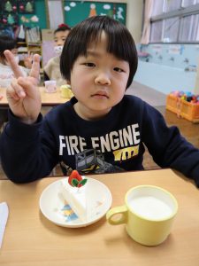 引き続き12月生まれのお友だちの『誕生会』を行いました。12月生まれのお友だちは全クラスで9名。ひよこ組さんは教室で、『うさぎ・くま・らいおん・ぞう組さん』は遊戯室で行いました。はじめに『お名前、年齢、好きな食べ物、大きくなったら何になりたいか』を発表し、担任の先生からのプレゼント渡しと記念撮影を行って誕生会を終了しました。