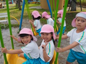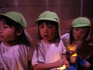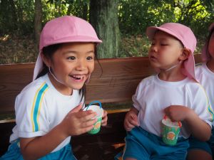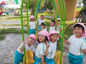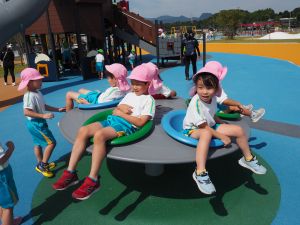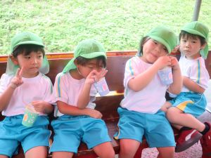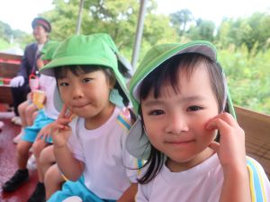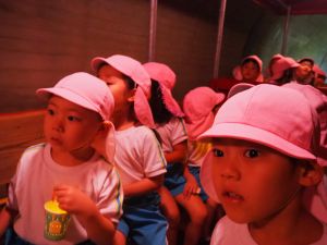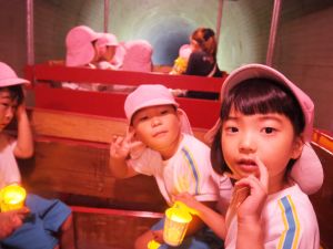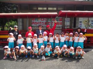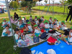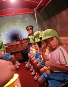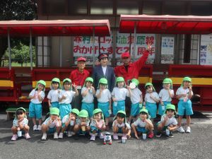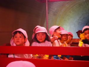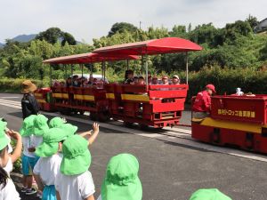 秋の遠足として『らいおん、ぞう組さん』が平成筑豊鉄道赤村駅にある『赤村トロッコの会』の皆様で運営されている【赤村トロッコ油須原線】に乗りに行ってきました。駅ではいつもお世話になっている赤村地域おこし協力隊の高野さんが待っていてくれました。今回はサプライズで味噌づくりなどでお世話になている道さんが駅掌の格好で登場し乗車記念切符をを子どもたちに渡してくれました。切符をもらった子どもたちはトロッコに乗車し運転手さんの出発進行の合図で大きな揺れを体感しながらトンネルを目掛け出発していきました。トンネルの中では高野さんからプレゼントしていただいたランタンを照らして楽しんだりトロッコの名物でもあるコウモリを観察したりして過ごしました。今年は今までに体験したことがないくらいたくさんのコウモリが飛んでいて子どもたちはびっくりしていました。最後にみんなで記念撮影をして次の目的地『大任道の駅』へ出発しました。道の駅では保護者に作っていただいたおにぎり弁当をいただき、新しくできた公園で遊んで保育所に帰ってきました。