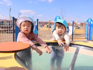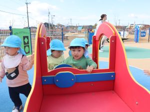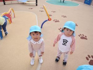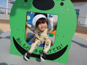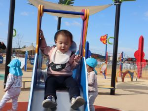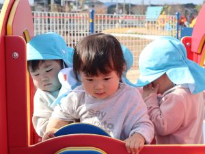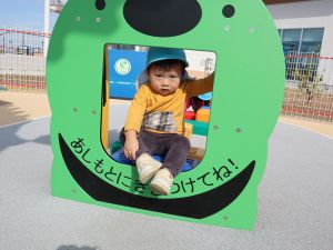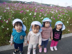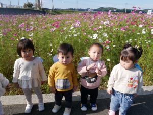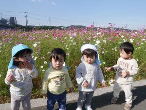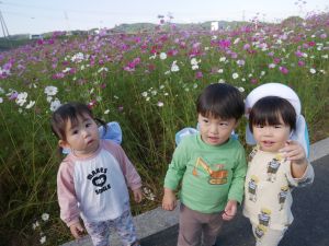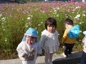 ひよこ組1歳児さんが園バスの乗って大任道の駅へ遊びに行ってきました。はじめに見ごろを迎えているコスモスを見に行き、そのあとは公園に移動し小さなお子さんでも遊べる『すくすくランド』で思いっきり遊んできました。この日は香春思永館の5、6年生が遠足に来ていて『かわいい!かわいい!』と声をかけられていました。また天気のいい日はお出かけしたいと思います。