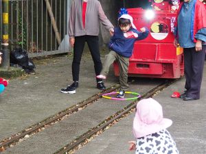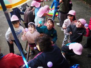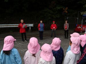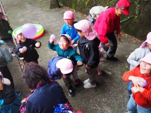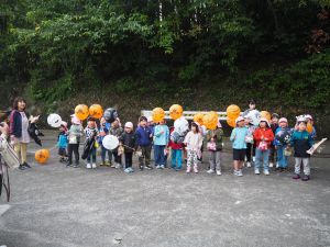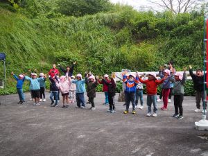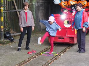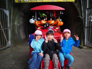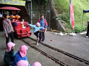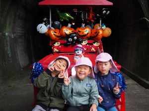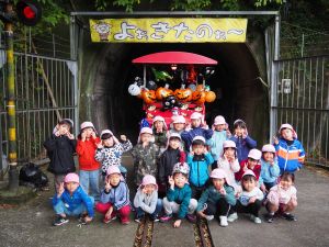 いつもお世話になっている赤村地域おこし協力隊の高野さんに招待され年長ぞう組さんが赤村にある旧油須原線本村トンネルに行ってきました。今回の目的は、高野さんが企画してくれた赤村トロッコミニ運動会を行うためです。10時から開会式を行い、トロッコの会の方に教えていただいたトロッコ風準備体操を行って第一種目『赤村トロッコつな引き』約6トンあるトロッコ列車との対決です。子どもたちみんなと本日参加してくれた保護者の方に参加していただき綱引きを行いました。1分間の対決でトロッコを約15m動かすことができました。続いて第二種目『トロッコ玉入れ』子どもたちと職員・保護者チームの対決です。結果は子どもたちの圧勝!。最後の種目は『トロッコ靴飛ばし』子どもたち一人一人が片足でスリッパを飛ばし誰が一番遠くに飛ばせるか対決しました。一番飛ばしたお友だちはみんなの倍の距離を飛ばしていました。最後に閉会式を行いみんなで『わいわい、がやがや』楽しむことができました。帰りに高野さんから子どもたちみんなにお土産をいただき子どもたちはさらに喜んでいました。