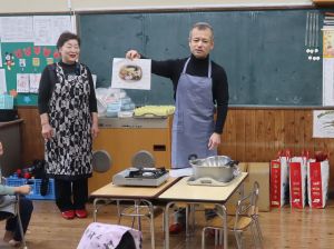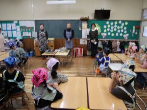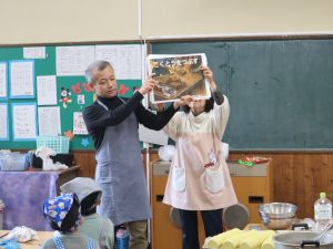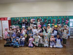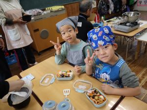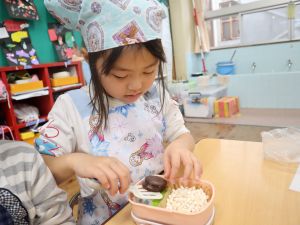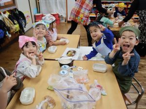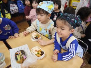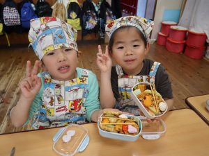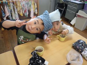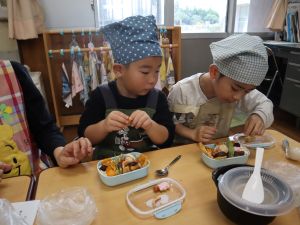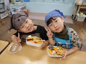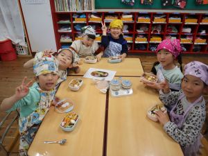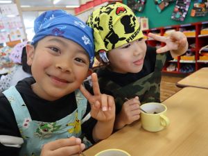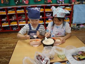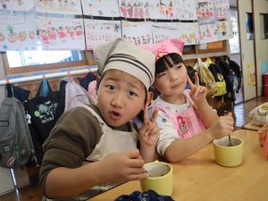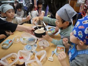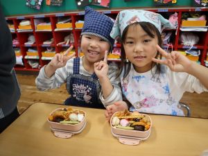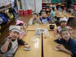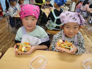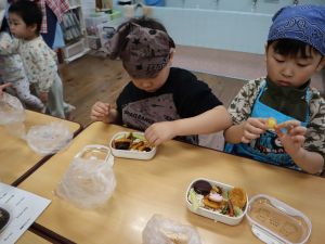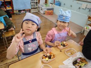 いつも楽しい企画で子どもたちを喜ばしてくれる『赤村地域おこし協力隊の高野さん』が今回は子どもたちが大好きなお菓子を使って『駄菓子弁当作り』を年長ぞう組さんに体験させていただきました。高野さんが教室に入ると子どもたちから『高野さん!高野さん‼』と来てくれるのを待っていたかのように声がかかります。今回はお菓子で作る弁当に子どもたちは始まる前から大興奮。お菓子を詰める弁当箱から食材のお菓子に至るまですべてを高野さんが準備してくれました。はじめにどのようなお弁当を作るのか写真で説明していただき、食材となるお菓子を各テーブルに配っていきました。そして調理器具まで準備していただきまるで料理をしているかのようにお弁当を作っていきます。『ごはんをポンポン菓子』具材の『ハンバーグはチョコパイ』などたくさんのお菓子をお弁当の食材に見立てて『駄菓子弁当』が完成しました。駄菓子弁当づくりの後は高野さんが紙芝居を交えて思い出の味『葛湯』を子どもたちに作っていただき試食しました。