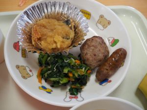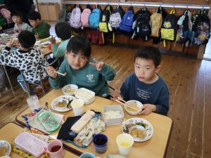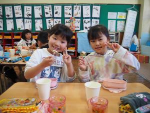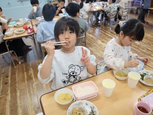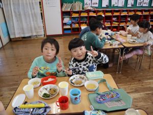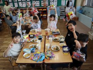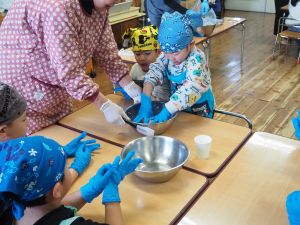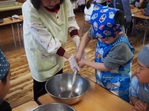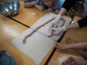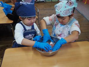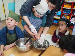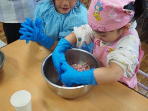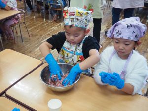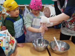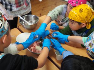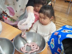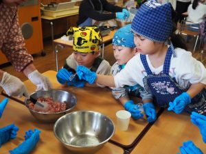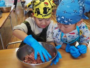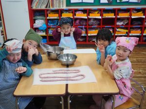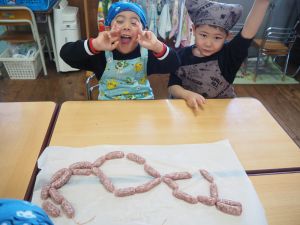 いつもお世話になっている赤村地域おこし協力隊の高野さん指導の下、年長ぞう組さんが今回はソーセージ作りに挑戦しました。高野さんが保育所に到着しただけで年長ぞう組のお友だちは玄関まで行き『高野さん!高野さん‼』と嬉しそうに声掛けをしていました。今回も食材すべてを高野さんが用意してくれ、赤村の道さんにお手伝いをしていただき本格的なソーセージ作りを子どもたちと一緒に行いました。はじめに食材の説明をしていただき、調理の開始です。ボールに赤村の豚肉ミンチを入れスパイスを混ぜ、水を足しながら全体がなじむまで混ぜていきます。混ぜ終わったミンチを絞り袋に入れ約2メートルある羊の腸に上手に詰めていきます。腸の中に詰め終わると食べやすい大きさにひねっていきその場所をハサミで切ってソーセージの完成です。他のクラスのお友だちもぞう組さんのソーセージ作りの見学にきていました。完成したソーセージは中まで火が入るように蒸し焼きにしていただきました。残った具材はハンバーグにしてお昼の給食としていただき、最後に高野さんから子どもたちみんなにお菓子のプレゼントまでいただきとてもうれしそうなぞう組さんでした。