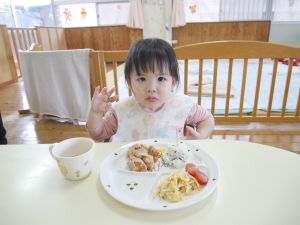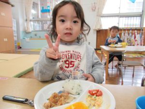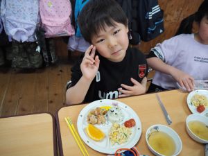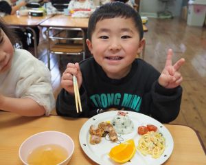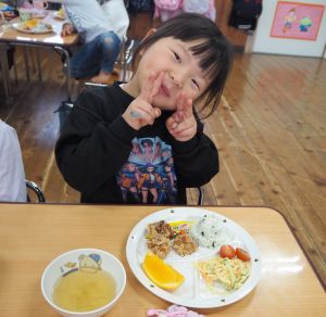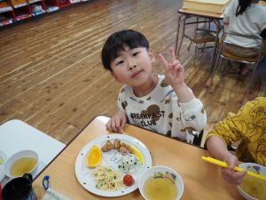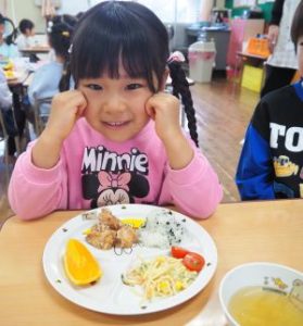 誕生会の日の給食の献立は『唐揚げ、サラスパ、ミニトマト、わかめご飯、オニオンスープ、ミカン』でした。