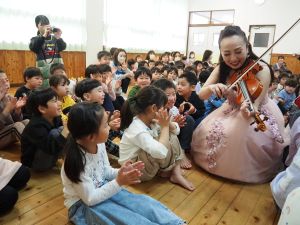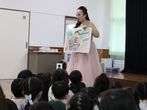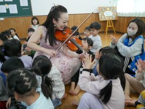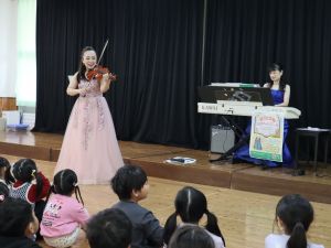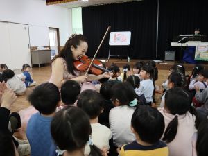 今年は3月生まれのお友だちの誕生会の日に毎年演奏をお願いしている香春町在住のバイオリニストと田川市在住のピアニストによる『ミニコンサート』を遊戯室で開催しました。いつもより30分早く3月生まれのお友だちの誕生会を行い、10時からミニコンサートを開催しました。クラシックの演奏やみんなが知っている曲の演奏もあり、いっしょに歌たりして、小さな子どもたちも演奏に聞き入っていました。0歳児のお友だちの中には子守歌に聞こえたのか眠ってしまった子もいました。子どもたちのアンコールにもこたえていただき子どもたちは喜んでいました。